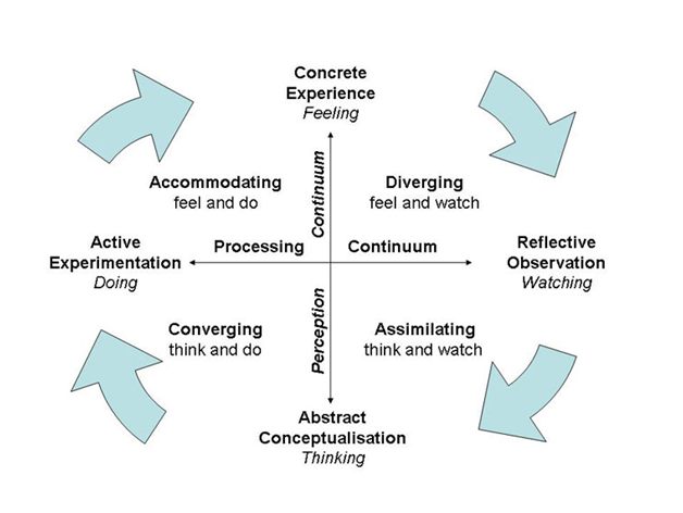 A visualization that is strongly related with the framework of THEAMA project can be seen in Kolb’s circle shown below. Kolb’s circle is one of the most popular models that show the relationship between experience, reflection, conceptualization and experimentation. It is based on the idea that some people need to start from a concrete situation, a motivating challenge to put in motion a personal learning development, which should cross the phases shown below to be merged and to introduce a new search or understanding.